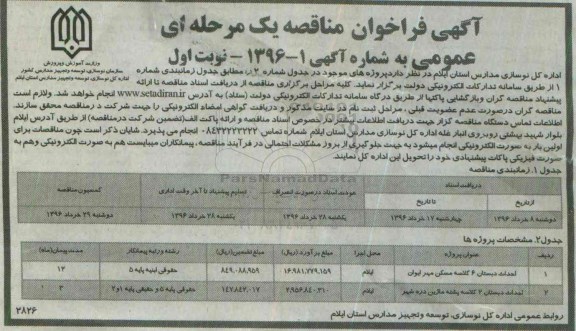 اداره کل نوسازی مدارس استان ایلام در نظر دارد پروژه های موجود در جدول شماره 2 را مطابق جدول زمانبندی شماره 1 از طریق سامانه تدارکات الکترونیکی دولت برگزار نماید. کلیه مراحل برگزاری مناقصه از دریافت اسناد مناقصه تا ارائه پیشنهاد مناقصه گران و بازگشایی پاکتها را از طریق درگاه سامانه تدارکات الکترونیکی دولت (ستاد) به آدرس ستاد انجام خواهد شد و لازم است مناقصه گران در صورت عدم عضویت قبلی، مراحل ثبت نام در سایت مذکور و دریافت گواهی امضای الکترونیکی را جهت شرکت در مناقصه محقق سازند.