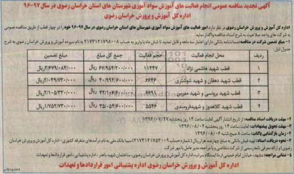 اداره کل آموزش و پرورش خراسان رضوی در نظر دارد امور فعالیت های آموزش سوادآموزی شهرستان های استان خراسان رضوی در سال 97-96 خود را در چهار قطب از طریق مناقصه عمومی به شرکت های واجد صلاحیت به شرح اسناد مناقصه واگذار نماید
