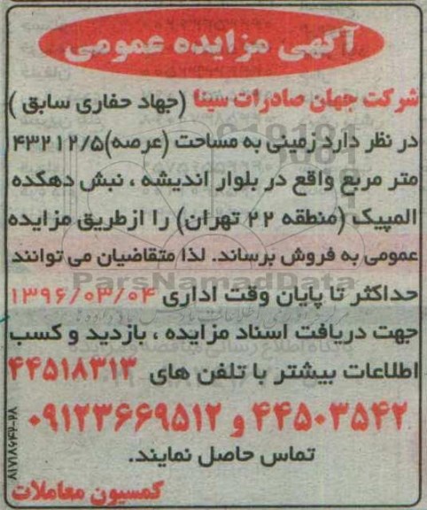 مزایده عمومی مزایده فروش زمین مساحت 43212.5مترمربع برگزار میگردد. از کلیه افراد متخصص و شرکت‌های واجد شرایط دعوت به عمل می‌آید تا در این مزایده با کد خبرگزاری پارس نماد : 852823 شرکت نمایند تاریخ شروع مزایده : 1396/02/31 مهلت شرکت در مزایده: تا پایان روز 1396/03/04 مکان برگزاری اموال واگذاری استان‌های تهران و دسته‌بندی‌های مربوط به این حراجی املاک و زمین میباشد.