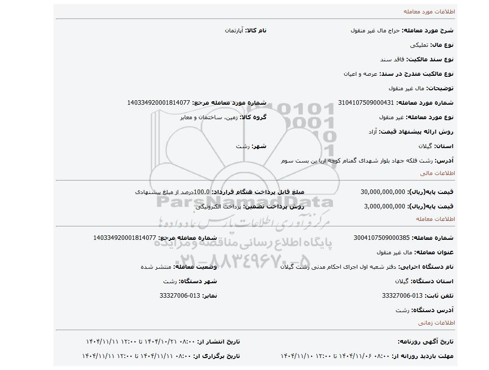| قیمت پایه(ریال): 30,000,000,000 | | مبلغ قابل پرداخت هنگام قرارداد: 100.0درصد از مبلغ پیشنهادی | | قیمت پایه(ریال): 3,000,000,000 | | روش پرداخت تضمین: پرداخت الکترونیکی |