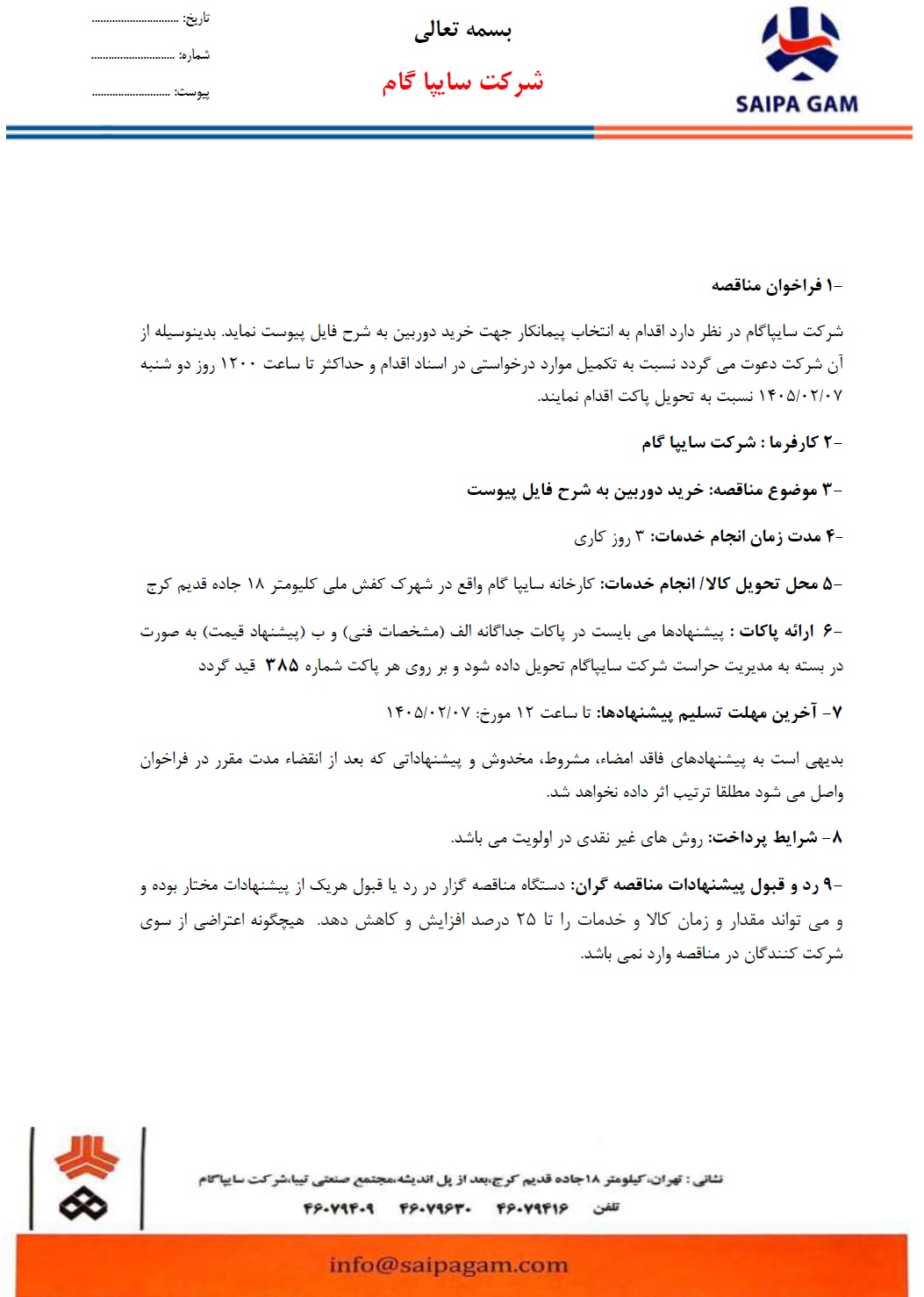 شرکت سایپا گام در نظر دارد اقدام به انتخاب پیمانکار جهت خرید دوربین به شرح فایل پیوست نماید. بدینوسیله از آن شرکت دعوت می گردد نسبت به تکمیل موارد درخواستی در اسناد اقدام و حداکثر تا ساعت 12:00 روز دوشنبه 1405.02.07 نسبت به تحویل پاکت اقدام نمایند.