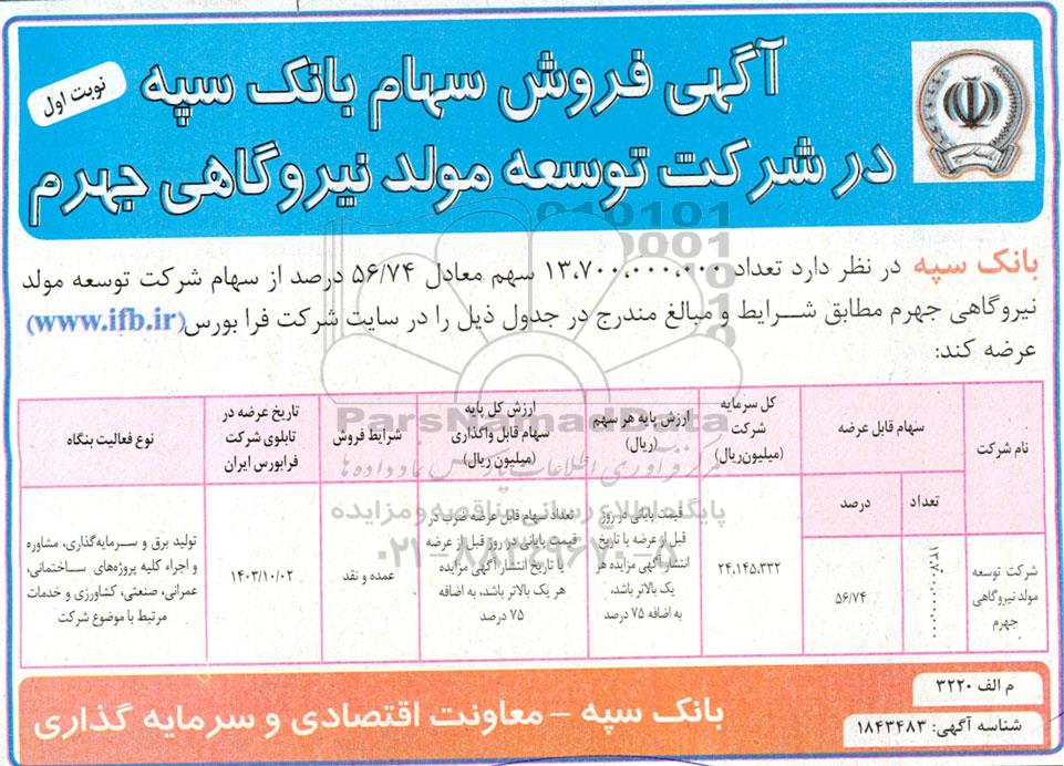 تلفن:5- 88349670 (021) فکس: 88349673 (021) Website: www.ParsNamadData.com E-mail: Info@ParsNamadData.com آگهی فروش سهام بانک سپه