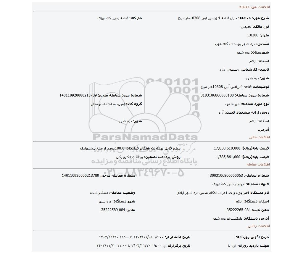 | عنوان آگهی: مزایده قطعه 4 زراعی آبی 10308متر مربع |