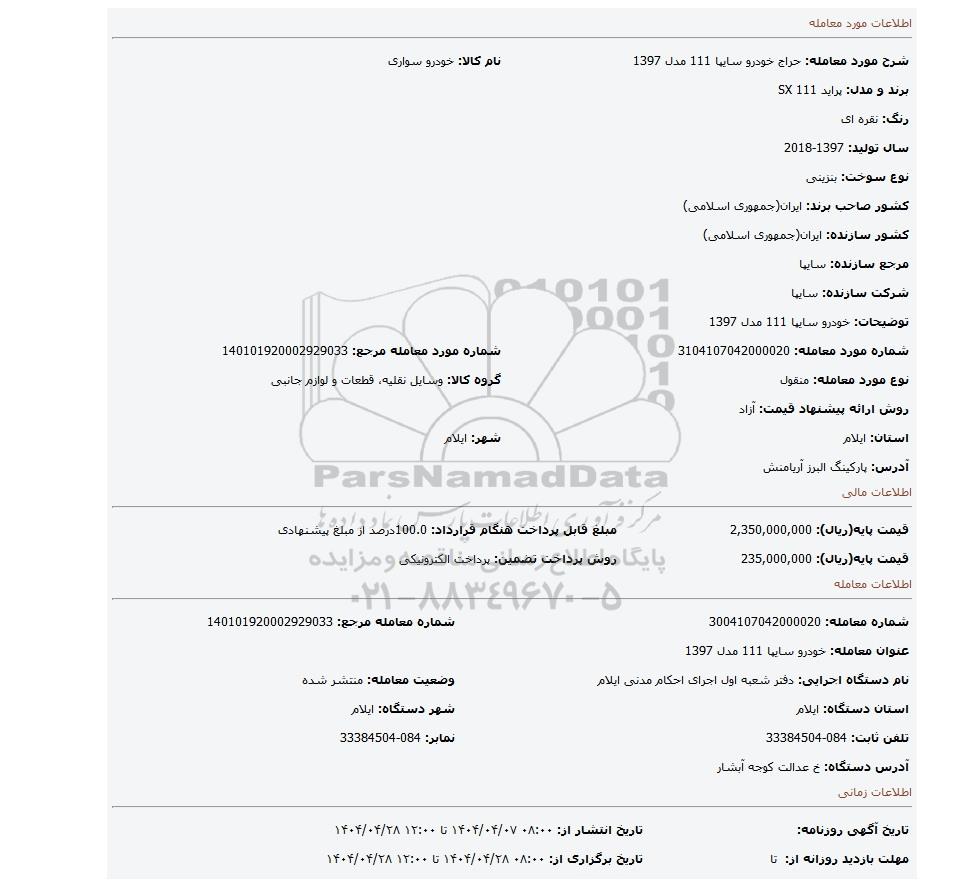 | عنوان آگهی: مزایده خودرو سایپا 111 مدل 1397 |