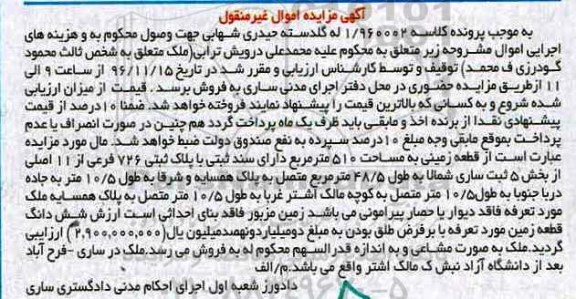 مزایده قطعه زمین مساحت 510 مترمربع کلاسه 1.960002