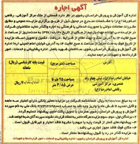 اداره کل اموزش و پرورش خراسان رضوی درنظردارد قسمتی از ملک مرکز اموزشی ، رفاهی امام رضا با مشخصات مندرج در جدول ذیل از طریق برگزاری مزایده عمومی و مطابق مقررات معاملات دولتی با محوریت خدماتی یا فرهنگی به اجاره واگذار نماید متقاضیان شرکت در مزایده می توانند جهت بازدید از مکان از تاریخ 1397.08.30 به مدت ده روز از ساعت 8 صبح تا 14 به ادرس ملک و جهت اطلاع از شرایط دریافت تکمیل و تحویل اسناد مزایده از تاریخ فوق به مدت ده روز از ساعت 8 صبح تا 14 به ادرس خیابان امام خمینی اداره کل اموزش و پرورش خراسان رضوی ساختمان شهید باهنر اداره پشتیبانی امور قراردادها و تعهدات مراجعه نمایند