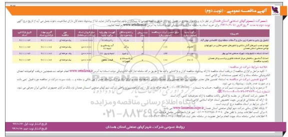 شرکت شهرکهای صنعتی استان همدان در نظر دارد پروژه های مندرج در جدول زیر را از طریق مناقصه عمومی به پیمانکاران واجد صلاحیت واگذار نماید. لذا از پیشنهاددهندگان دارای صلاحیت، دعوت بعمل می آید از تاریخ درج آگهی دوم به مدت ۳ روز کاری تا 97.10.20 برای خرید اسناد به سامانه تدارکات الکترونیکی دولت (ستاد) به آدرسWWW . setadiran . ir مراجعه نمایید.