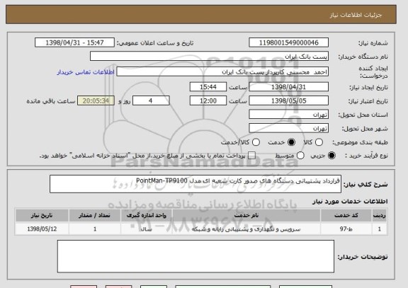 شرح کلی نیاز: قرارداد پشتیبانی دستگاه های صدور کارت شعبه ای مدل PointMan-TP9100