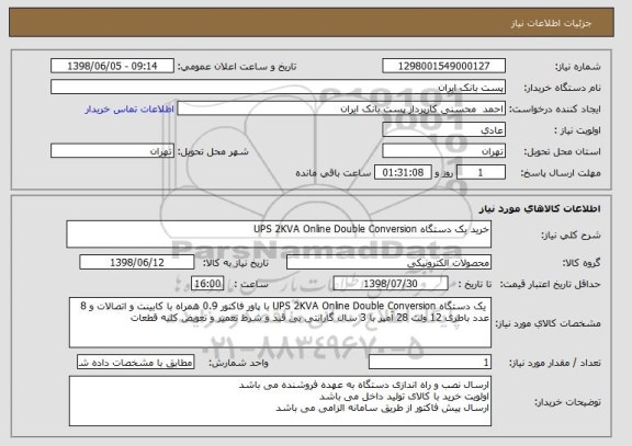 استعلام خرید یک دستگاه UPS 2KVA Online Double Conversion , استعلام خرید یک دستگاه UPS 2KVA Online Double Conversion