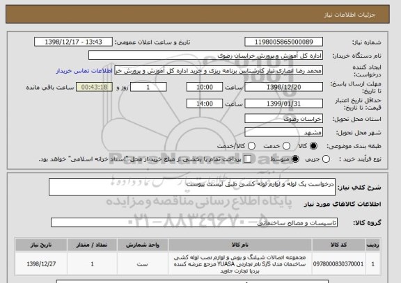 شرح کلی نیاز: درخواست پک لوله و لوازم لوله کشی طبق لیست پیوست