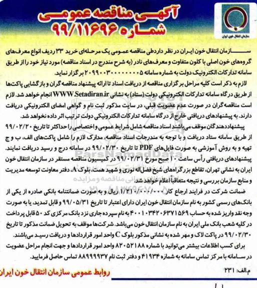 پیشنهاددهندگان موظف می باشند اسناد مناقصه شامل شرایط عمومی و اختصاصی را حداکثر تا تاریخ 99.02.20 از طریق سامانه ستاد دریافت و با توجه به مندرجات اسناد مناقصم مدارک لازم را شامل پاکات الف، ب و ج تهیه و به روش آموزشی بصورت فایل های PDF تا تاریخ 99.02.30 در سامانه فوق درج و رسید دریافت نمایند. پیشنهادهای دریافتی راس ساعت 10 صبح مورخ 99.02.31 در کمیسیون مناقصه به نشانی سازمان انتقال خون ایران واقع در تقاطع بزرگراههای شیخ فضل اله نوری و شهید همت بلوک a در دفتر معاونت توسعه مدیریت و منابع سازمان بررسی و نتیجه متعاقبا اعلام خواهد شد.