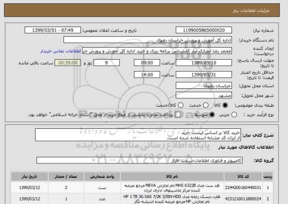 نام دستگاه خریدار:اداره کل آموزش و پرورش خراسان رضوی