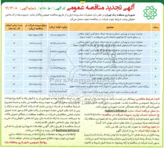 منطقه یک تهران در نظر دارد عملیات مشروحه ذیل را از طریق مناقصه عمومی
