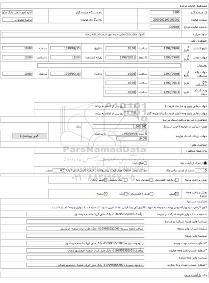 مزایده، اموال مازاد بانک ملی اداره امور شعب استان زنجان , اموال مازاد بانک ملی اداره امور شعب استان زنجان
