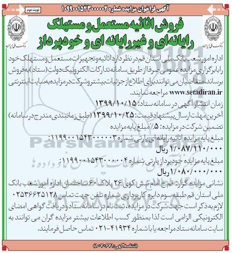 اداره امور شعب بانک ملی استان قم در نظر دارد اثاثیه و تجهیزات مستعمل و مستهلک خود را با برگزاری مزایده عمومی صرفا از طریق سامانه تدارکات الکترونیک دولت (ستاد) به فروش برساند. متقاضیان می توانند برای اطلاع از جزئیات بیشتر و شرکت در مزایده به سایت اینترنتی سایت ستاد ایران مراجعه نمایند.