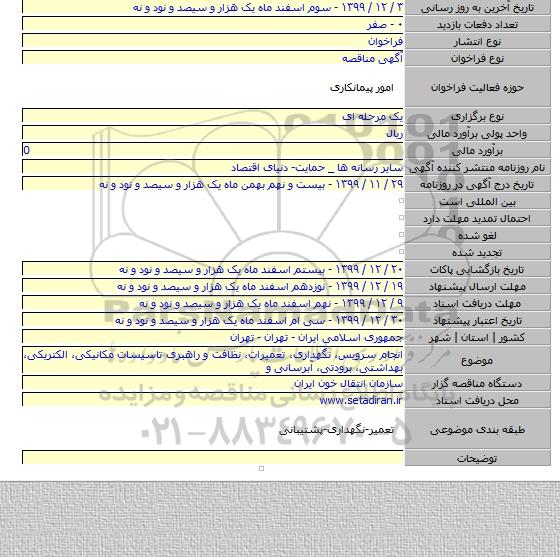 انجام سرویس، نگهداری، تعمیرات، نظافت و راهبری تاسیسات مکانیکی، الکتریکی، بهداشتی، برودتی، آبرسانی و