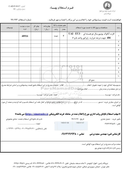 استعلام کارت آنالوگ یونیورسال دو هسته ای UAI-EU3 486 از کلیه افراد متخصص و شرکتها واجد شرایط دعوت به عمل میآید در مناقصه با کد خبرگزاری پارس نماد: 3283322 شرکت نمایند.