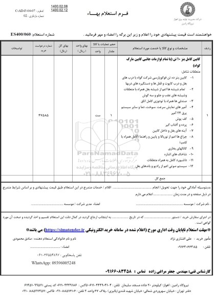 استعلام بها و موضوع استعلام استعلام کابین کامل بنز 10 تن ... به اطلاع کلیه شرکتها و افراد متخصص واجد شرایط میرساند، آگهی گذار در نظر دارد از طریق استعلام بها، نسبت به انتخاب و دریافت پیشنهادات اقدام نماید. این استعلام با کد آگهی ثبت شده در سامانه خبرگزاری پارس نماد : 3371418 منتشر شده است. مشخصات استعلام : تاریخ شروع استعلام: 1400/02/11 آخرین مهلت ارسال پیشنهاد قیمت : 1400/02/12 و محل اجرای پروژه : استان خوزستان میباشد. استعلام قیمت مورد درخواست : استعلام کابین کامل بنز 10 تن ... با دستهبندیهای تخصصی و گروه های مرتبط : تامین،تعمیرات و اجاره خودروهای سنگین و نیمه سنگین, قطعات خودرو, استعلام اطلاع رسانی میگردد.