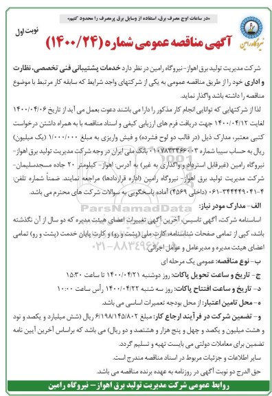 شرکت مدیریت تولید برق اهواز ـ نیروگاه رامین در نظر دارد خدمات پشتیبانی فنی تخصصی، نظارت و اداری