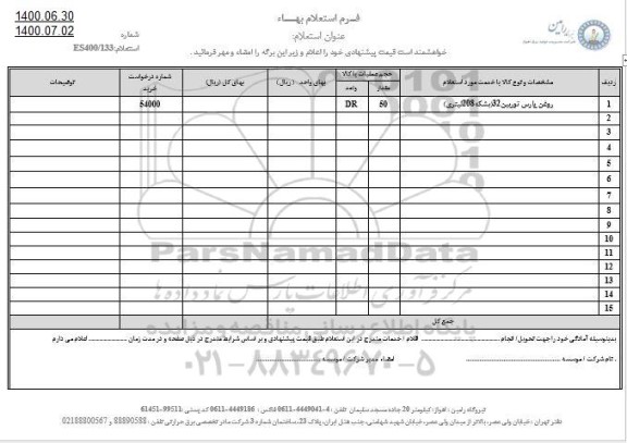 | 1 | روغن پارس توربین 32 (بشکه 208 لیتری ) |