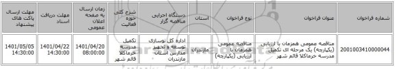 | 2001003410000044 | مناقصه عمومی همزمان با ارزیابی (یکپارچه) یک مرحله ای تکمیل مدرسه خرماکلا قائم شهر | مناقصه عمومی همزمان با ارزیابی (یکپارچه) | مازندران | اداره کل نوسازی توسعه و تجهیز مدارس استان مازندران | تکمیل مدرسه خرماکلا قائم شهر | 1401/04/20 08:00:00 | 1401/04/22 14:30:00 | 1401/05/05 14:30:00 |