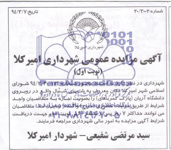 شهرداری در نظر دارد به اسناد مجوز شماره 174- 94.2.30 شورای اسلامی شهر امیرکلا مکان معروف به شبهای شمال واقع در روبروی دانشگاه آریان (پارک کمربندی) را بصورت اجاره به متقاضیان واجد شرایط از طریق مزایده حضوری (حارج) واگذار نماید.