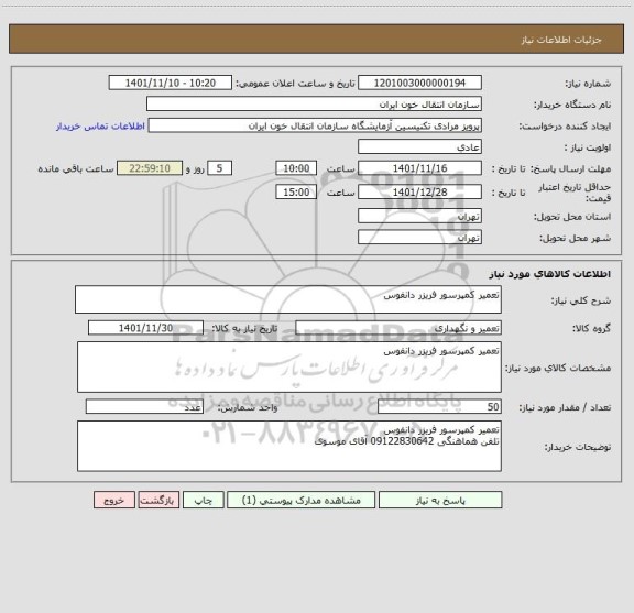 شرح کلی نیاز: تعمیر کمپرسور فریزر دانفوس