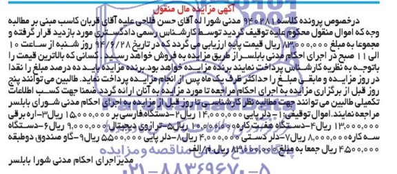 مزایده در تاریخ 94.6.28 روز شنبه از ساعت 10 الی 11 صبح برگزار می شود.
