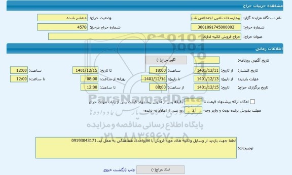 | نام دستگاه مزایده گزار | بیمارستان تامین اجتماعی شهریار | وضعیت حراج | منتشر شده | |