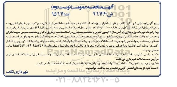شهرداری تکاب در نظر دارد اجرای پروژه احداث تقاطع غیرهمسطح و ساماندهی ترافیکی مسیر کمربندی ، خیابان تختی و سه راه قجور ( پل قجور ) را به مبلغ کل برآورد اولیه 17.230.000.000 ریال از محل اعتبارات استانی و بودجه داخلی سال 95 شهرداری براساس فهرست بهاء راه و باند فرودگاه و زیرسازی راه آهن سال 94 بدون تعدیل با مشخصات مندرج در اسناد مناقصه از طریق برگزاری مناقصه عمومی به پیمانکاران واجد شرایط واگذار نماید.