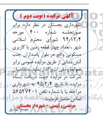 مزایده عمومی مزایده واگذاری تعداد 4 قطعه زمین با کاربری مسکونی نوبت دوم برگزار میگردد. از کلیه افراد متخصص و شرکتهای واجد شرایط دعوت به عمل میآید تا در این مزایده با کد خبرگزاری پارس نماد : 646032 شرکت نمایند تاریخ شروع مزایده : 1395/01/23 مهلت شرکت در مزایده: تا پایان روز 1395/02/04 مکان برگزاری اموال واگذاری استانهای خراسان رضوی و دستهبندیهای مربوط به این حراجی املاک و زمین میباشد.