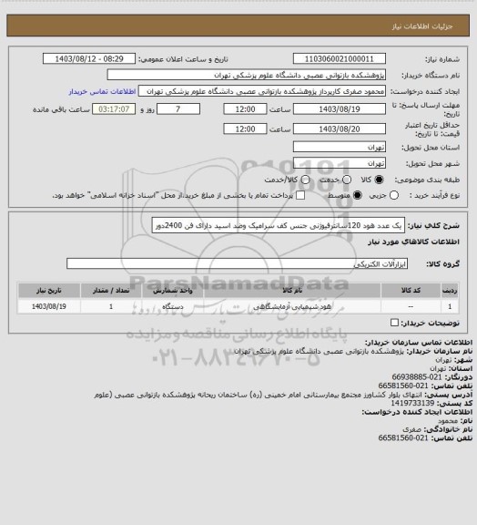 شرح کلی نیاز: یک عدد هود 120سانترفیوژنی جنس کف سرامیک وضد اسید دارای فن 2400دور