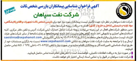 شرکت نفت سپاهان در نظر دارد جهت تکمیل لیست پیمانکاران مورد نیاز خود برای بازرسی شخص ثالث تجهیزات و اقلام پالایشگاهی ، مواد اولیه و شیمیایی (داخل و خارج از کشور ) اقدام به دریافت رزومه شرکت ها نماید.