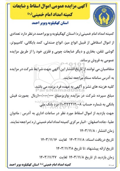 کمیته امداد امام خمینی (ره) استان کهگیلویه و بویراحمد در نظر دارد تعدادی از اموال اسقاطی از قبیل انواع میز، انواع صندلی، کمد بایگانی، کامپیوتر ، گوشی تلفن، بخاری و دیگر ضایعات چوبی و فلزی خود را از طریق مزایده عمومی به فروش برساند.