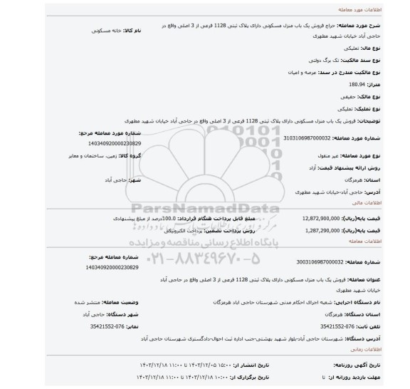 | عنوان معامله: فروش یک باب منزل مسکونی دارای پلاک ثبتی 1128 فرعی از 3 اصلی واقع در حاجی آباد خیابان شهید مطهری | ||