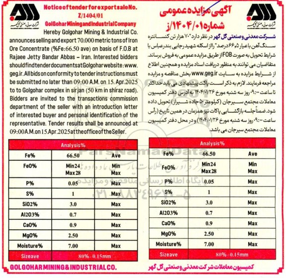 شرکت معدنی و صنعتی گل گهر (سهامی عام) در نظر دارد 70 هزار تن کنسانتره سنگ آهن با عیار 66.5 درصد را از شهید رجایی بندرعباس با شرایط تحویل به صورت FOB از طریق مزایده عمومی به فروش برساند. متقاضیان می توانند به منظور دریافت اسناد مزایده و همچنین اطلاع از شرایط مزایده به سایت WWW.GEG.IR بخش مناقصه و مزایده مراجعه نمایند.