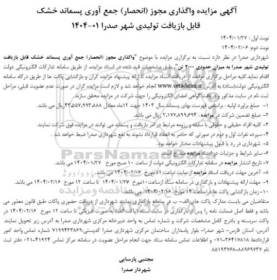 آگهی مزایده واگذاری مجوز (انحصار) جمع آوری پسماند خشک قابل بازیافت تولیدی شهر صدرا 01-1404