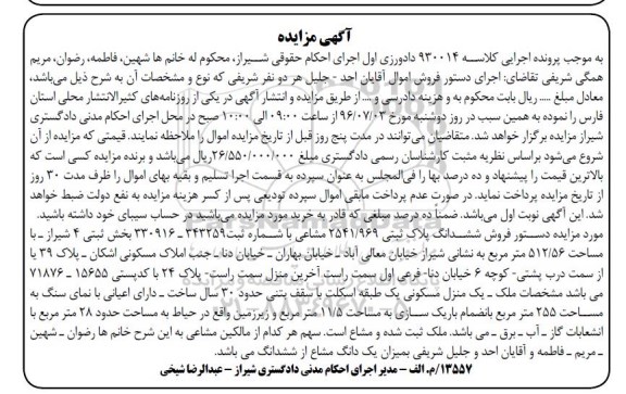 مزایده ششدانگ پلاک ثبتی مساحت 512.56متر به کلاسه 930014