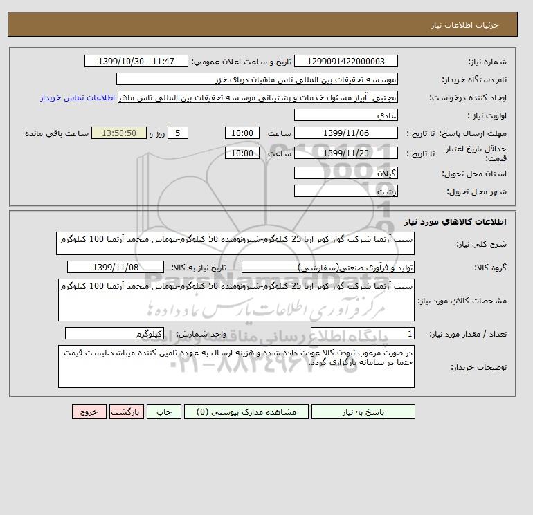 تلفن:5- 88349670 (021) فکس: 88349673 (021) Website: www.ParsNamadData.com E-mail: Info@ParsNamadData.com استعلام سیت آرتمیا شرکت گوار کویر اریا 25 کیلوگرم-شیرونومیده 50 کیلوگرم-بیوماس منجمد آرتمیا 100 کیلوگرم