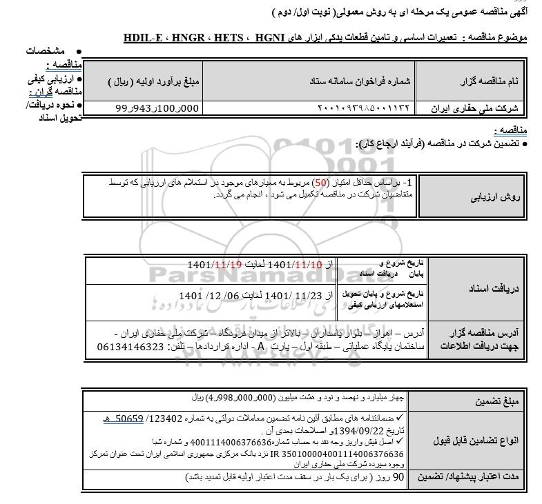 موضوع مناقصه : تعمیرات اساسی و تامین قطعات یدکی ابزار های HGNI ، HETS ، HNGR ، HDIL-E