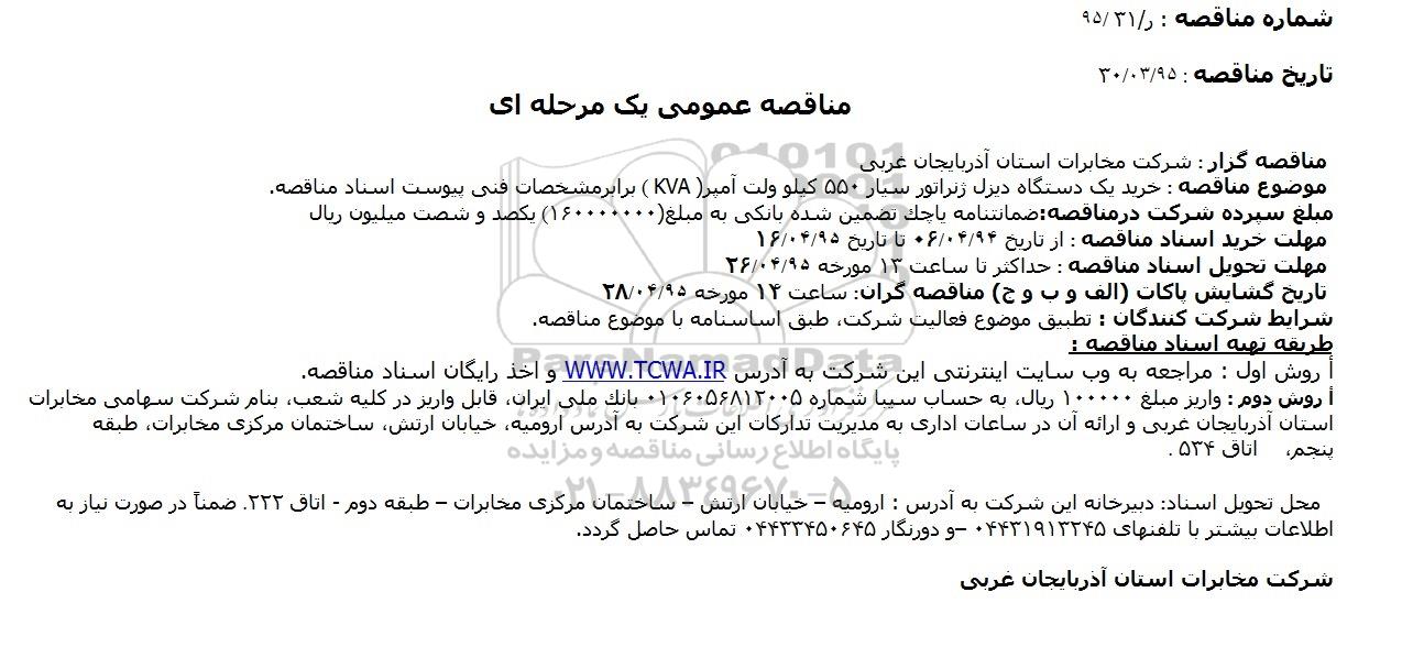 مناقصه گزار : شرکت مخابرات استان آذربایجان غربی