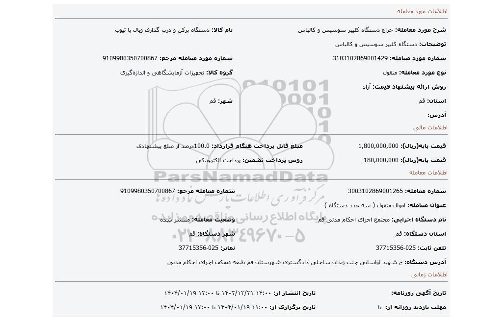 | تاریخ آگهی روزنامه: | | تاریخ انتشار از: ۱۴۰۳/۱۲/۲۱ ۱۴:۰۰ تا ۱۴۰۴/۰۱/۱۹ ۱۲:۰۰ | | مهلت بازدید روزانه از: تا | | تاریخ برگزاری از: ۱۴۰۴/۰۱/۱۹ ۱۱:۰۰ تا ۱۴۰۴/۰۱/۱۹ ۱۲:۰۰ |