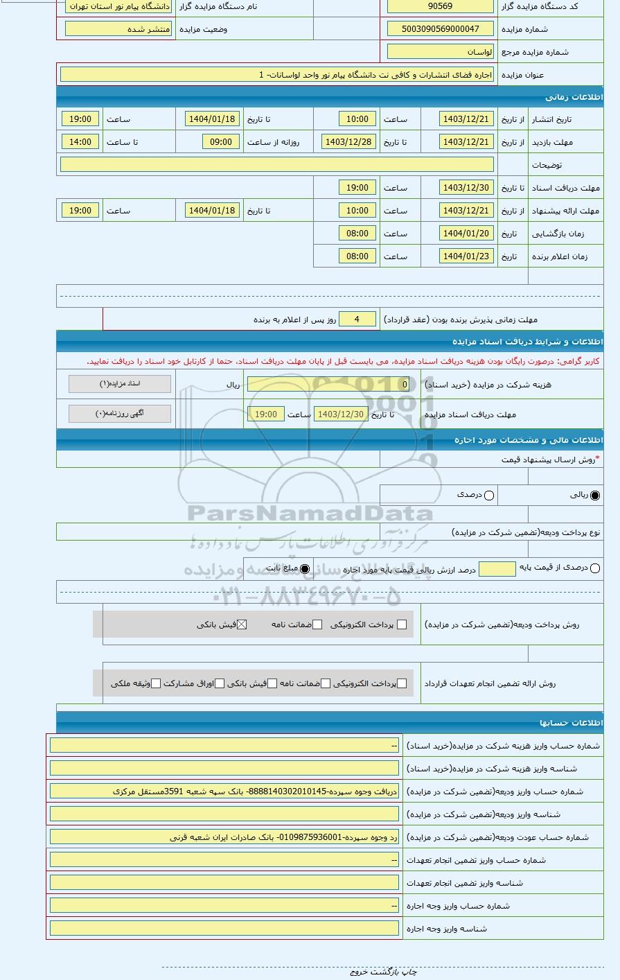 جزئیات آگهی| کد مزایده گزار | 90569 | | نام دستگاه مزایده گزار | دانشگاه پیام نور استان تهران | | شماره مزایده | 5003090569000047 | | | | | شماره مورد اجاره | 5103090569000046 | | نوع برگزاری مزایده |