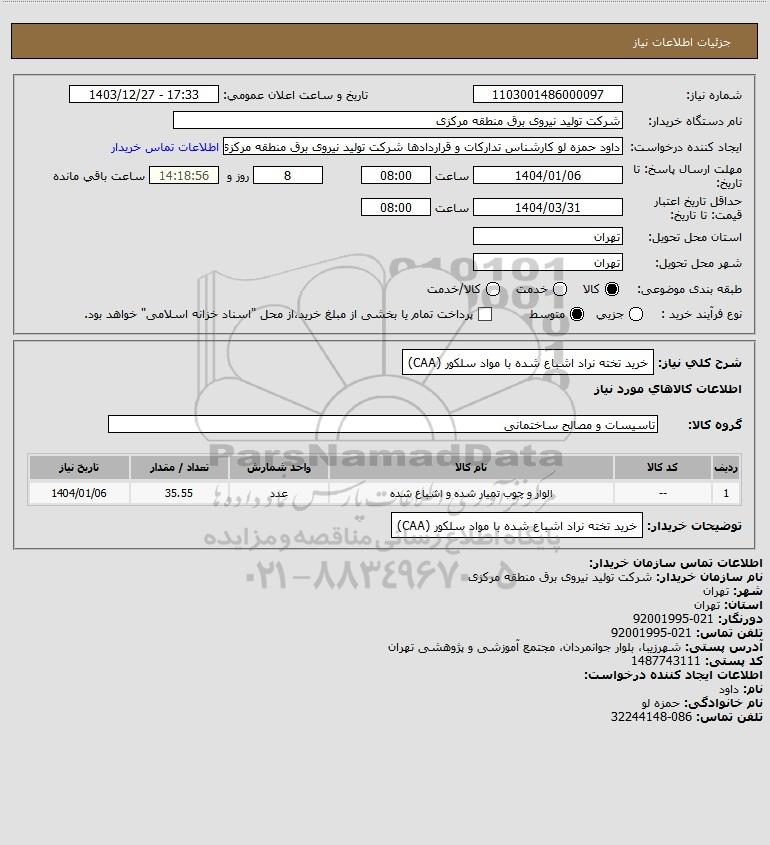 تلفن:5- 88349670 (021) فکس: 88349673 (021) Website: www.ParsNamadData.com E-mail: Info@ParsNamadData.com استعلام خرید تخته نراد اشباع شده با مواد سلکور (CAA)
