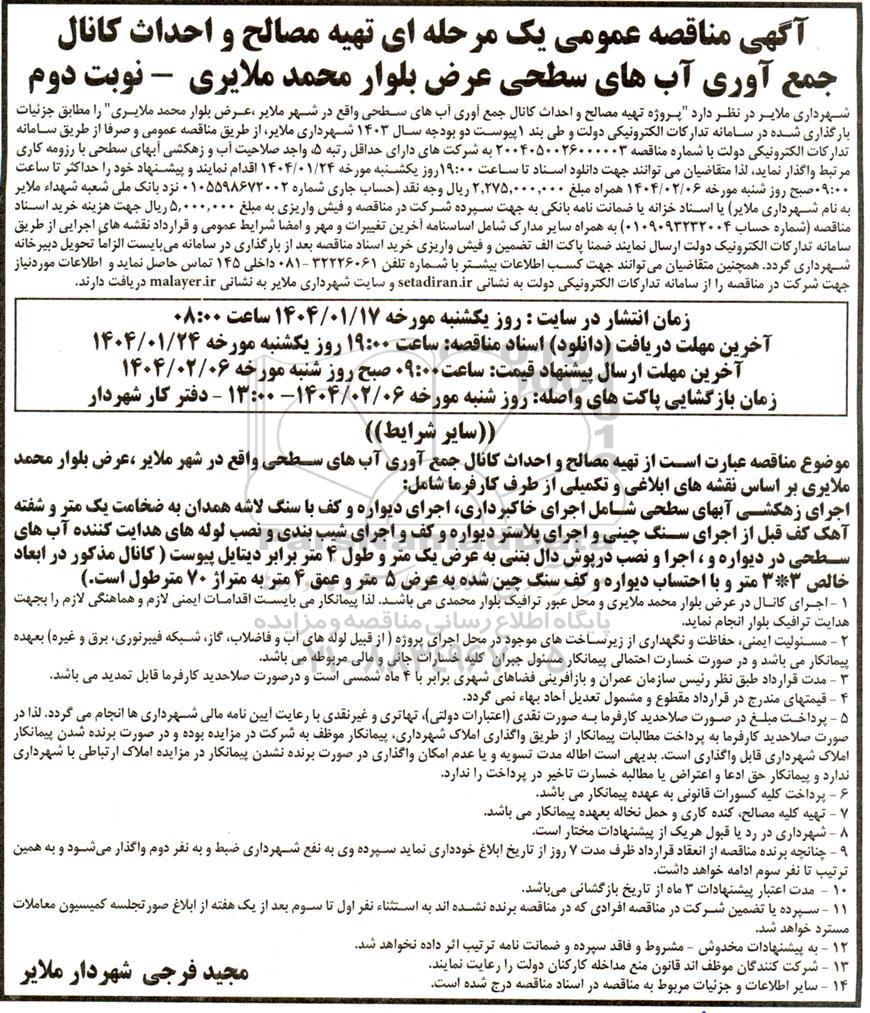 شهرداری ملایر در نظر دارد پروژه تهیه مصالح و احداث کانال جمع آوری آبهای سطحی واقع در شهر ملایر ، عرض بلوار محمد ملایری را مطابق جزئیات بارگذاری شده در سامانه تدارکات الکترونیکی دولت و طی بند 1 پیوست دو بودجه سال 1403 شهرداری ملایر از طریق مناقصه عمومی و صرفا از طریق سامانه تدارکات الکترونیکی دولت با شماره مناقصه 2004050026000003 به شرکتهای دارای حداقل رتبه 5 واجد صلاحیت آب و زهکشی آبهای سطحی با رزومه کاری مرتبط واگذار نماید لذا متقاضیان میتوانند جهت دانلود اسناد تا ساعت 19:00 روز یکشنبه مورخه 1404.01.24 اقدام نمایند و پیشنهاد خود را حداکثر تا ساعت 09:00 صبح روز شنبه مورخه 1404.02.06 همراه مبلغ 2.275.000.000 ریال وجه نقد حساب جاری شماره 0105598672002 نزد بانک ملی شعبه شهداء ملایر به نام شهرداری (ملایر یا اسناد خزانه یا ضمانت نامه بانکی به جهت سپرده شرکت در مناقصه و فیش واریزی به مبلغ 5.000.000 ریال جهت هزینه خرید اسناد مناقصه شماره حساب 0109093232004) به همراه سایر مدارک شامل اساسنامه آخرین تغییرات و مهر و امضا شرایط عمومی و قرارداد نقشه های اجرایی از طریق سامانه تدارکات الکترونیک دولت ارسال نمایند ضمنا پاکت الف تضمین و فیش واریزی خرید اسناد مناقصه بعد از بارگذاری در سامانه میبایست الزاما تحویل دبیرخانه شهرداری گردد. همچنین متقاضیان میتوانند جهت کسب اطلاعات بیشتر با شماره تلفن 32226061 - 081 داخلی 145 تماس حاصل نماید و اطلاعات مورد نیاز جهت شرکت در مناقصه را از سامانه تدارکات الکترونیکی دولت به نشانی ستاد ایران و سایت شهرداری ملایر به نشانی malayer.ir دریافت دارند.