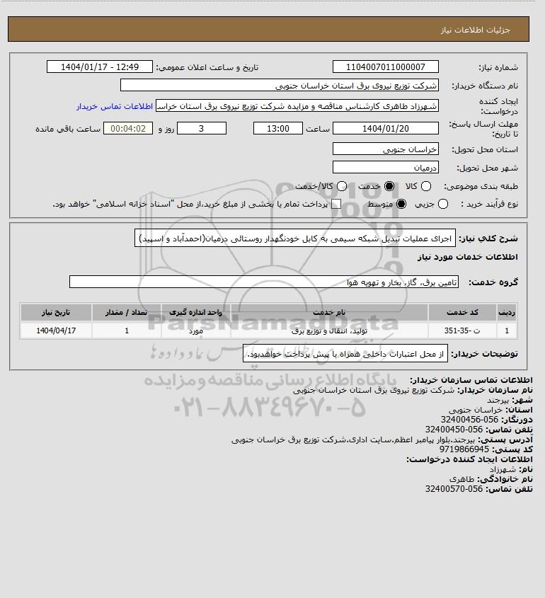 تلفن:5- 88349670 (021) فکس: 88349673 (021) Website: www.ParsNamadData.com E-mail: Info@ParsNamadData.com استعلام اجرای عملیات تبدیل شبکه سیمی به کابل خودنگهدار روستائی درمیان(احمدآباد و اسپید)