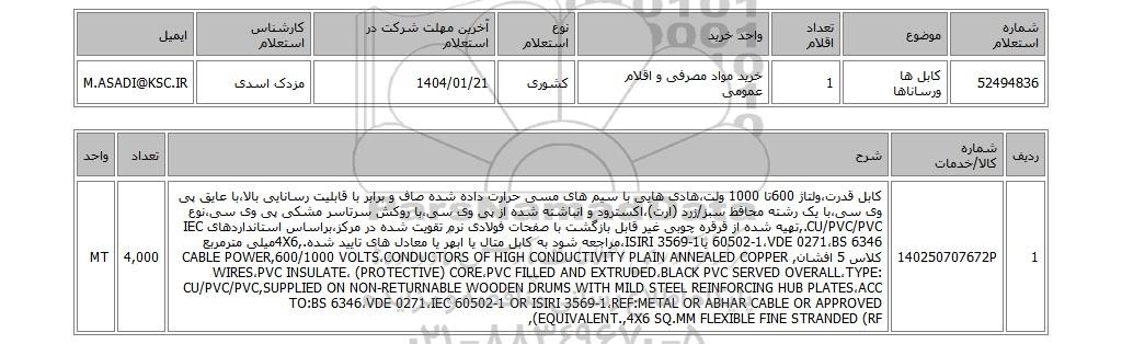| ردیف | شماره کالا/خدمات | شرح | تعداد | واحد | | 1 | 140250707672P | کابل قدرت،ولتاژ 600تا 1000 ولت،هادی هایی با سیم های مسی حرارت داده شده صاف و برابر با قابلیت رسانایی بالا،با عایق پی وی سی،با یک رشته محافظ سبز/زرد (ارت)،اکسترود و انباشته شده از پی وی سی،با روکش سرتاسر مشکی پی وی سی،نوع CU/PVC/PVC.,تهیه شده از قرقره چوبی غیر قابل بازگشت با صفحات فولادی نرم تقویت شده در مرکز،براساس استانداردهای IEC 60502-1،VDE 0271،BS 6346 یاISIRI 3569-1،مراجعه شود به کابل متال یا ابهر یا معادل های تایید شده.,4X6میلی مترمربع کلاس 5 افشان,