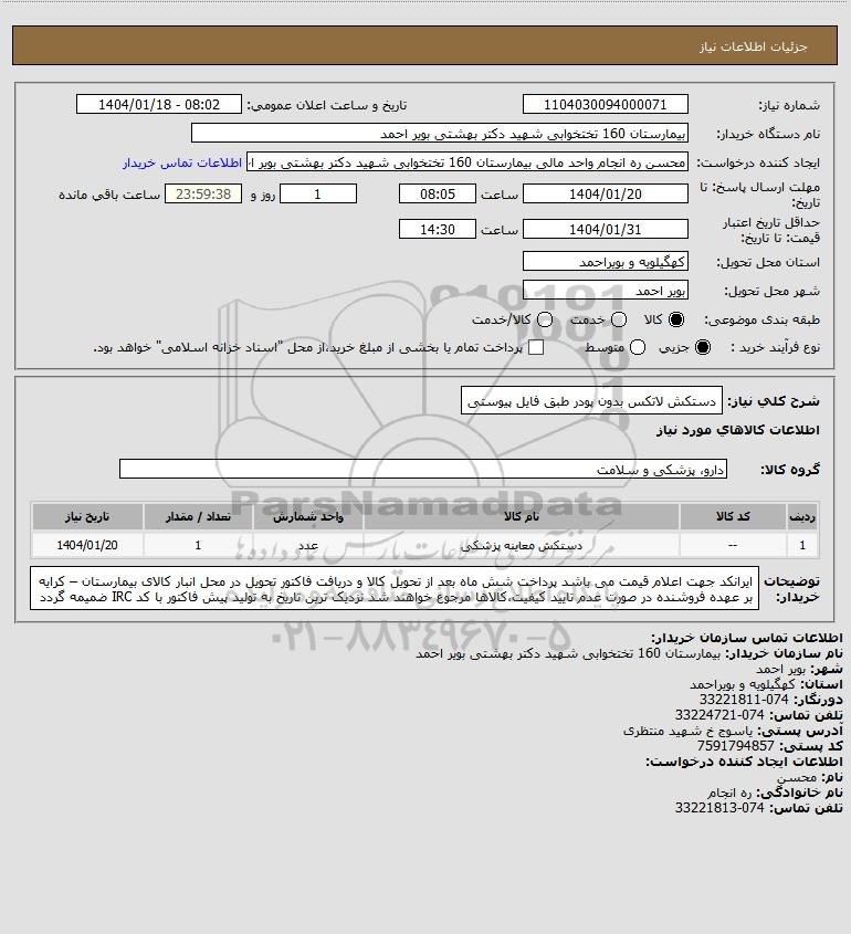 تلفن:5- 88349670 (021) فکس: 88349673 (021) Website: www.ParsNamadData.com E-mail: Info@ParsNamadData.com استعلام دستکش لاتکس بدون پودر طبق فایل پیوستی