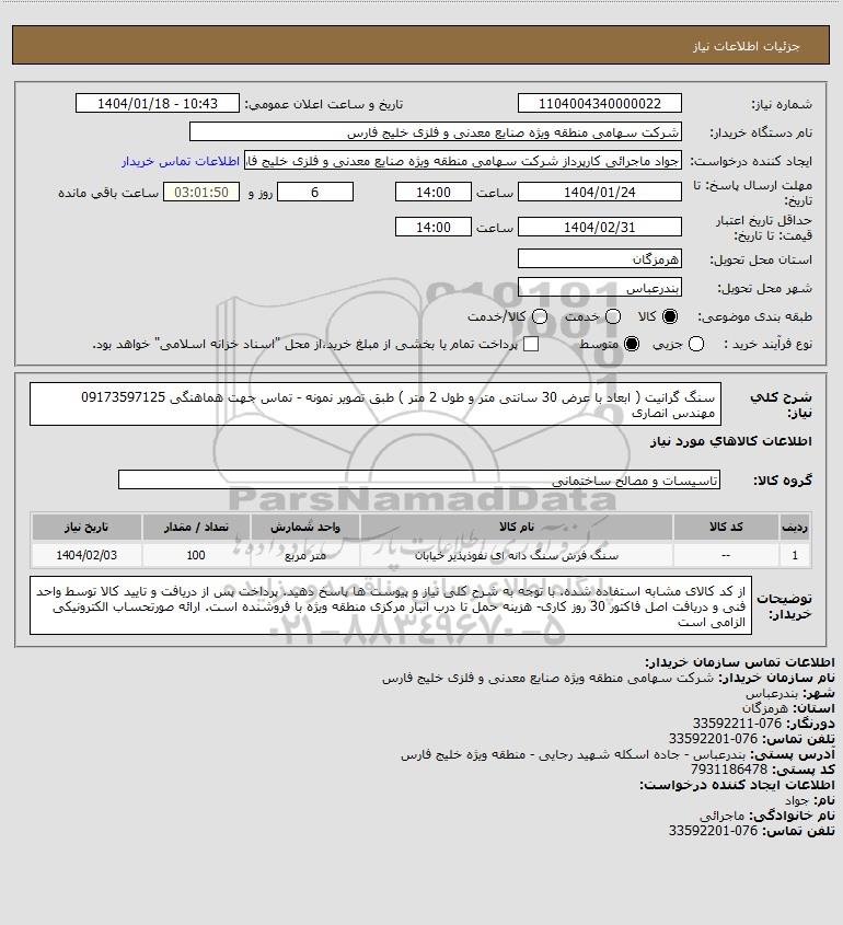تلفن:5- 88349670 (021) فکس: 88349673 (021) Website: www.ParsNamadData.com E-mail: Info@ParsNamadData.com استعلام سنگ گرانیت ( ابعاد با عرض 30 سانتی متر و طول 2 متر ) طبق تصویر نمونه - تماس جهت هماهنگی 09173597125 مهندس انصاری
