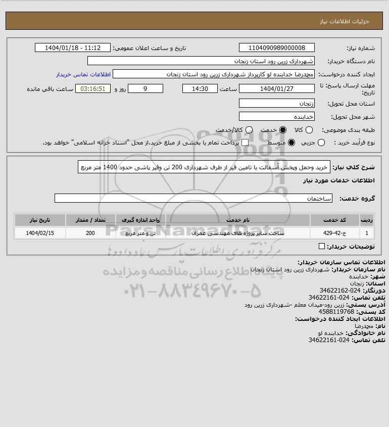 تلفن:5- 88349670 (021) فکس: 88349673 (021) Website: www.ParsNamadData.com E-mail: Info@ParsNamadData.com استعلام خرید وحمل وپخش آسفالت با تامین قیر از طرف شهرداری 200 تن وقیر پاشی حدود 1400 متر مربع